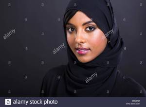 This photo is on Alamy.com and listed under the tags of pretty young Muslim woman (head shot over black background).