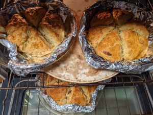 Beat egg into bowl. Mix in yogurt and oil. Mix honey. Add all-purpose flour and baking powder. Mix in apricot cut into chunks. Add walnuts and bread flour. Mix. Add walnuts and enough flour so that the dough isn’t sticky. Make a ball and put on to either wax paper or foil-lined pie pan. Cut into six sections.